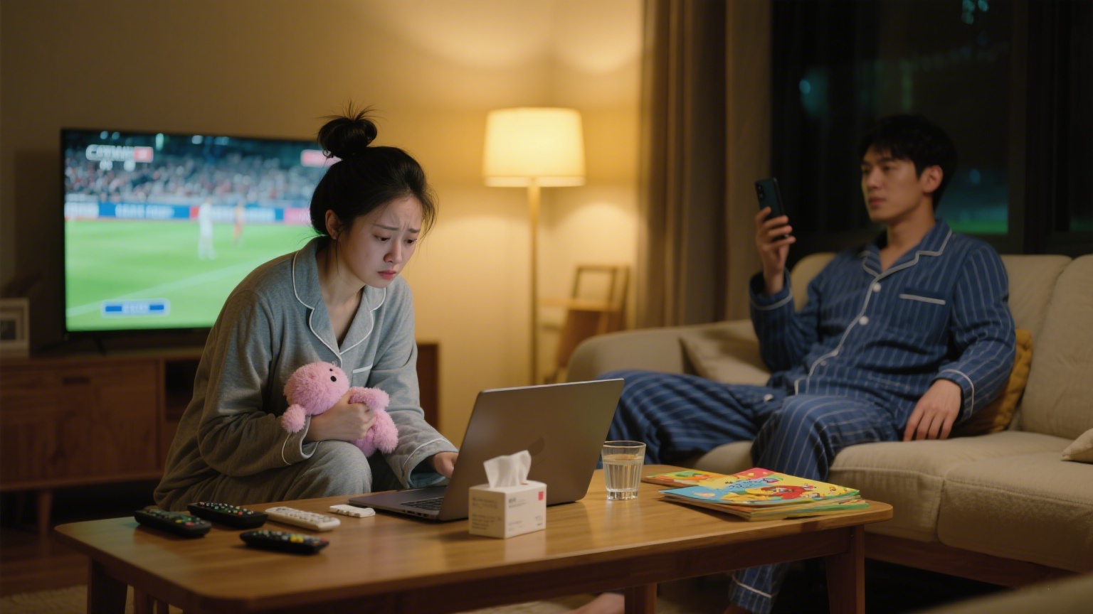 就像這張插圖里的場景:深夜的客廳,妻子一邊收拾孩子散落的玩具,一邊盯著電腦回復工作消息,桌上還放著沒喝完的感冒藥;而丈夫坐在旁邊看電視,手里拿著手機刷新聞,全程沒抬頭看妻子一眼。很多時候,婚姻里的失望,不是因為大事,而是這些 “我在受苦,你卻看不見” 的瞬間,慢慢攢成了鴻溝。